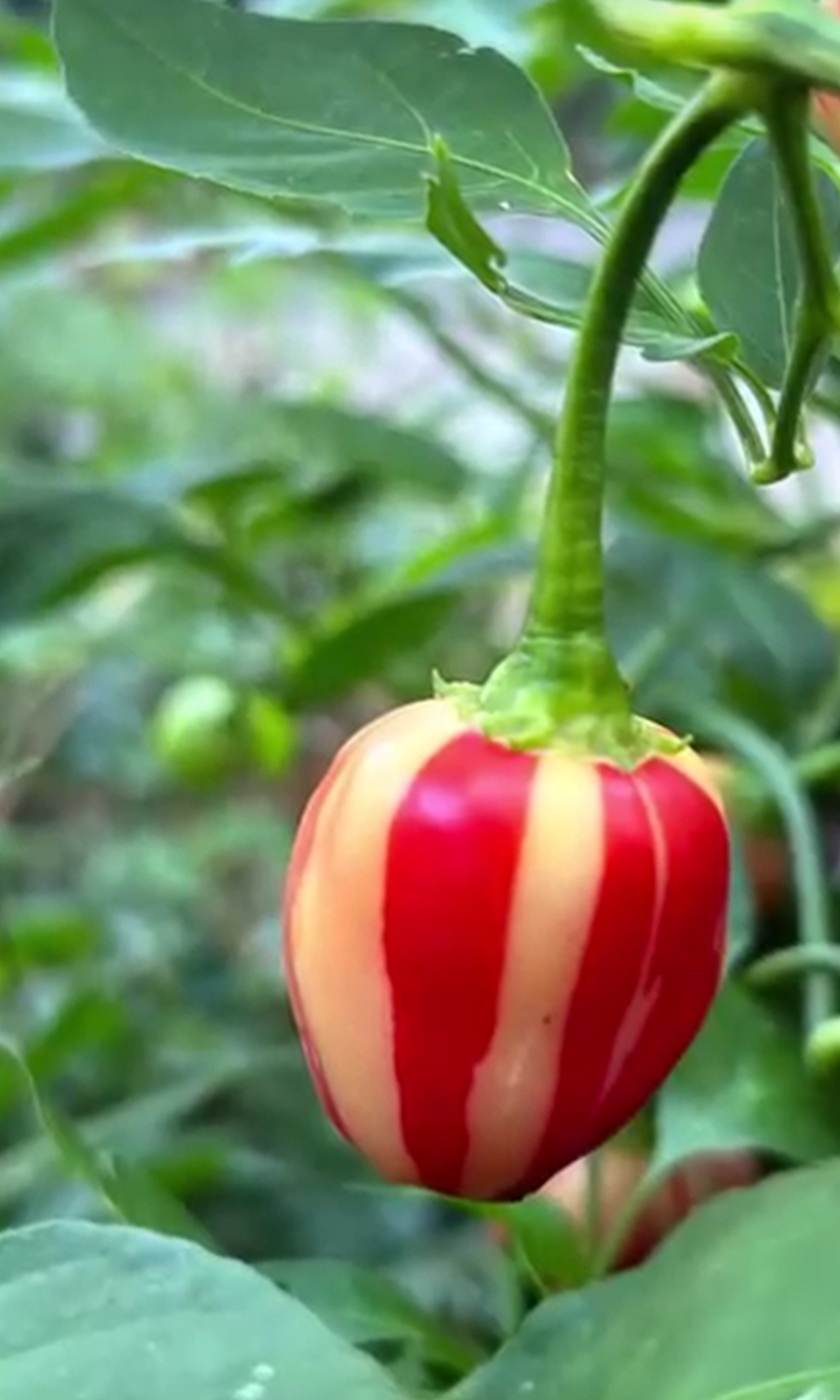 De Peppa Peach Stripey is een echte blikvanger in de moestuin. Deze bijzondere peper dankt zijn naam aan de warme perzikkleur en de subtiele strepen die over de vrucht lopen. Het resultaat is een prachtige, bijna tropisch ogende peper die niet zou misstaan in een siertuin.